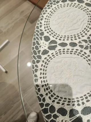 Mesa de camilla de 70 cm de diámetro por 76 de alto ,con cristal va incluido el brasero y las faldas y tapete - Encimera de cristal. - Base de tela con detalles. - Diseño circular.