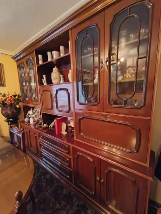 Mueble de salón de madera oscura con vitrinas y cajones, mesa y sillas opcional 140 euros mueble/mesa y sillas. - Diseño clásico y elegante. - Acabado en madera de cerezo. - Puertas de cristal con detalles. - Amplio espacio de almacenamiento.