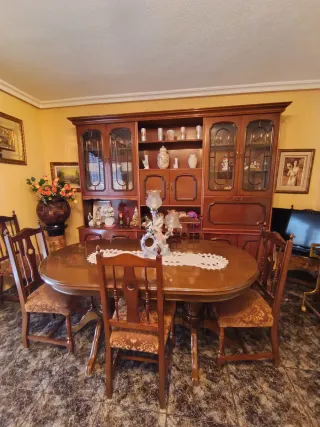 Conjunto de muebles de comedor de madera, estilo años 80. Incluye mesa y sillas. - Mesa de comedor ovalada. - Seis sillas de comedor con asientos tapizados. - Aparador/vitrina de madera con puertas y estantes. Se encuentra en perfecto estado, con muy poco uso. A recoger en Murcia.