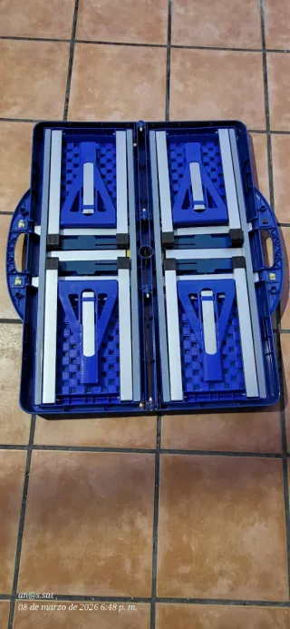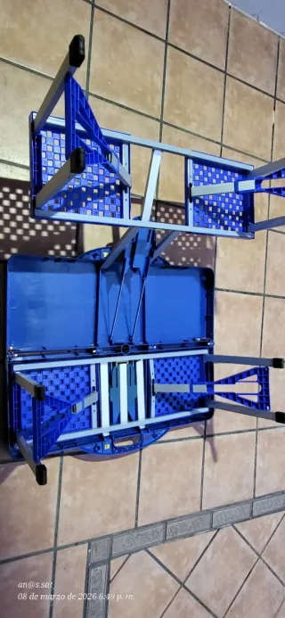 Conjunto de mesa y cuatro sillas plegables, ideal para picnics y actividades al aire libre. Se pliega fácilmente para su transporte y almacenamiento. - Diseño compacto y portátil. - Estructura robusta para mayor estabilidad. Hay que poner una o dos tuercas que se han caído. Una pieza del cierre de la maleta está rota. Pero cumple su función. No la arreglo porque ya no la utilizo. Para quien quiera aprovechar, es una ganga.