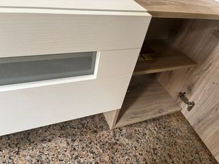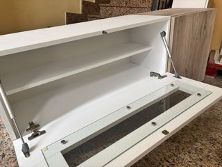 Mueble de salón moderno con diseño modular. - Combina acabados en blanco. - Incluye módulos de almacenamiento con puertas y estantes. - Superficie amplia para TV y decoración. -Mueble bajo con puerta abatible. -Mueble medio con tres puertas de cristal, una leja en su interior con luz led azul. -Mueble superior con puerta abatible. -Leja superior y leja inferior al suelo. -Se puede ver sin compromiso. ¡¡¡¡¡ solo para recoger, el mueble esta montado!!!!!
