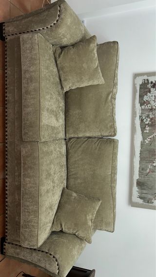 Sofá de 3 plazas con un diseño elegante y bonito. Tapizado en tela aterciopelada. Es de tres plaza pero caben 4 personas muy fácilmente. Los compramos hace menos de 4 meses, y lo vendemos porque queremos un color mas claro, es comodismo 🔴¡¡¡¡ SU PAREJA ESTA EN MI PERFIL !!!!🔴 - Color: beige y marrón. - Material: tela, terciopelo.