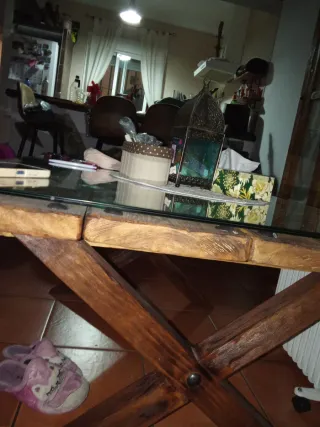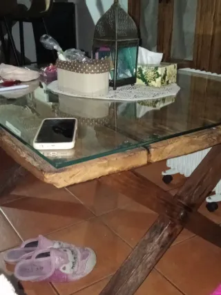 Mesa camilla con cristal , lista para darle un toque especial a tu hogar. - Medidas: 1,20 metros de largo por 0,70 metros de ancho. - Cristal transparente. - Estructura de madera.