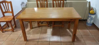 Conjunto de mesa de comedor con cuatro sillas a juego, fabricado en madera. - Mesa de comedor. - Cuatro sillas de madera. - Medidas mesa 150 x 80 - Recogida en el Lebrija