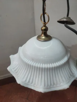 Elegante lámpara de techo con un diseño vintage. Combina materiales de cristal y metal con acabados dorados y blancos. - Diseño con detalles acanalados en el cristal. - Cadena y soporte metálico en tono dorado.