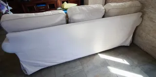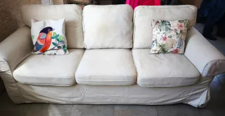 Sofá de tres plazas de la serie Ektorp de Ikea. Precio Nuevo en tienda 460 euros. Lo vendo por 200 negociable. - Tapicería de tela. - Color beige. - En buen estado. -Desenfundable. -Se puede cambiar la funda por una de la serie Ektorp. A recoger en Pola de Gordon.