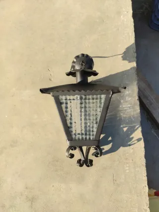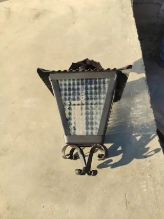 Farol de estilo rústico para exteriores. - Estructura principal de metal. - Paneles de cristal con diseño cuadriculado. - Soporte decorativo de metal forjado.