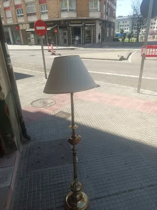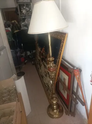 Elegante lámpara de pie con un diseño clásico. - Pantalla de tela en color beige. - Base y estructura metálica en tono dorado. - Detalle central de madera.