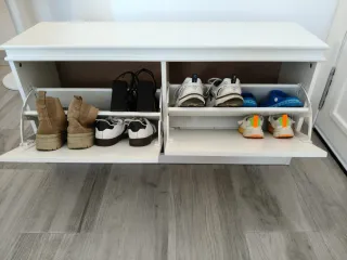 Mueble versátil que puede usarse como zapatero o estantería. - Diseño moderno y funcional. - Acabado en color blanco.