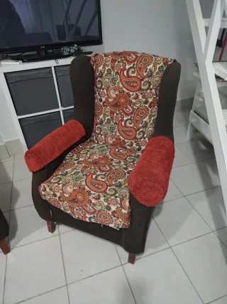 Se venden dos sillones individuales con un diseño llamativo y cómodo. - Tapicería con estampado paisley en tonos marrones y multicolores. - Reposabrazos en color terracota. - Estructura de madera. Se venden a muy buen precio por renovación de muebles un precio de ganga 20€ la pareja!!