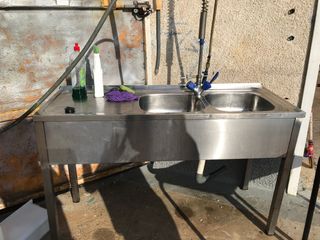 Fregadero de dos senos, práctico y fácil de mover. Ideal para espacios donde se necesite una solución de lavado temporal. - Estructura principal de metal. - Senos de acero inoxidable. - Grifería de plástico azul.