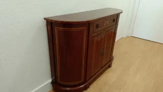 Elegante mueble recibidor con un diseño clásico y acabados cuidados. - Diseño curvo. - Detalles de marquetería dorada. - Un cajón superior. - Dos puertas con tiradores ornamentados. - Capacidad de almacenaje.