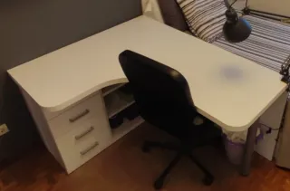 Escritorio en forma de L con un diseño moderno y funcional. - Superficie amplia de color blanco. - Mueble lateral con tres cajones. - Compartimentos de almacenaje abiertos. - Patas metálicas resistentes.