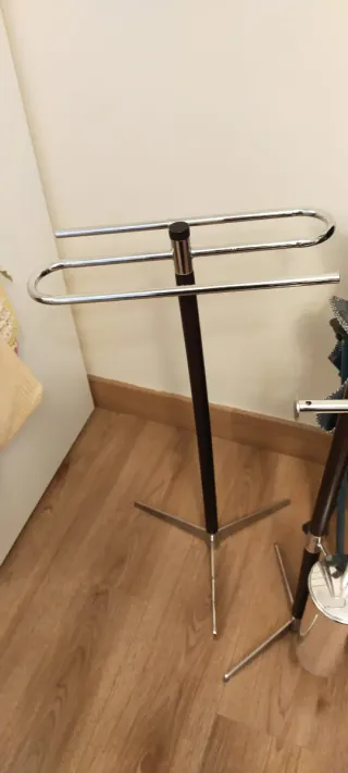 Conjunto de toallero y escobillero con un diseño moderno. - Fabricado en metal y madera. - Acabado en color plata y marrón.