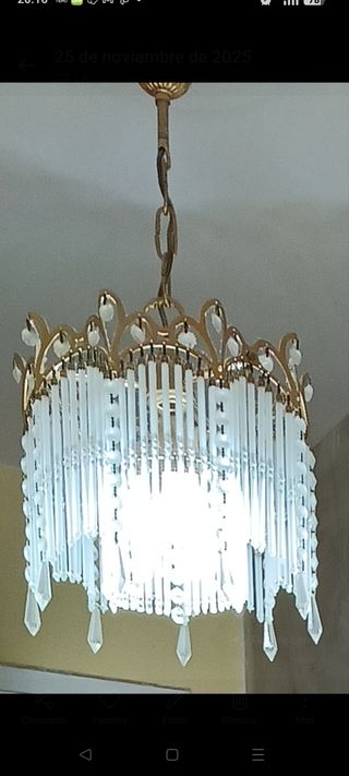 Dos elegantes lámparas de araña con un diseño clásico y detalles en cristal. - Estructura principal en metal dorado. - Colgantes de cristal transparente. - Diseño de dos niveles.