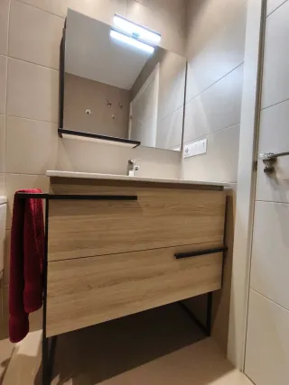 Conjunto de mueble de baño y espejo a juego. El mueble tiene un diseño moderno con patas metálicas y acabados en madera. - Mueble de baño con dos cajones. - Espejo con marco negro y luz integrada. - Combinación de materiales: madera y metal. El lavabo y grifo no están incluidos.