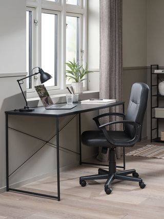 Escritorio de estilo moderno, ideal para gaming. Su diseño combina una superficie amplia con patas robustas. - Acabado en color negro. - Estructura metálica. - Altura regulable Subo la foto de Internet porque actualmente tengo el escritorio lleno de cosas