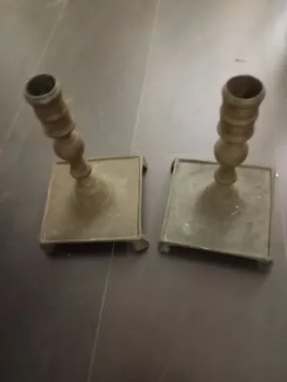 Elegante pareja de candelabros con una base cuadrada y un diseño clásico. - Fabricados en metal. - Color marrón y dorado.