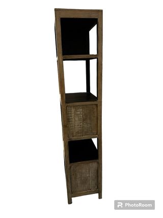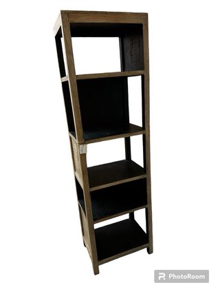 Librería en madera natura. Con acabado en barniz al agua, transparente y estantes en negro, con un diseño muy exclusivo y acabada por los cuatro lados. Nueva a estrenar. 51x36x175cm 199€.