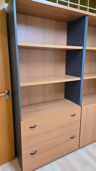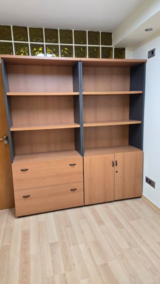 Conjunto de muebles de librería con un diseño moderno y funcional. - Estructura de melamina y aglomerado. - Acabado en tonos marrones y grises. - Incluye estanterías abiertas y compartimentos cerrados con puertas. - Dispone de cajones para almacenamiento de carpetas colgantes 200 euros la unidad y 350 por el conjunto