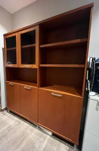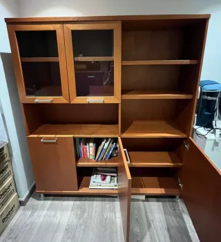 Mueble de almacenaje versátil con puertas de cristal y compartimentos. 1 desperfecto en el lateral (ver imágen). - Diseño de madera en tono marrón. - Puertas superiores con cristal. - Amplios estantes para libros y objetos. -Tiradores de madera