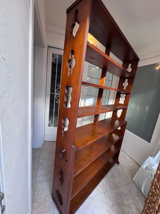 Mueble tipo librería con múltiples estantes para organizar tus libros y objetos. - Estructura de madera. MUY SOLIDO Excelente para libros. transporte a cargo comprador - Estantes de madera. - Detalles en metal. - Compartimentos de plástico.