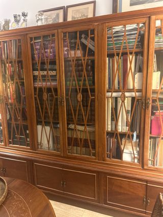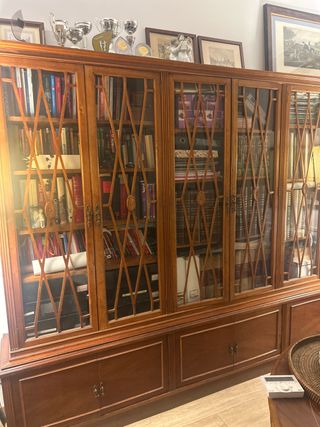 Elegante librería de estilo inglés con puertas de cristal. es una pieza unica - Acabado en madera de color marrón. - Detalles dorados. - Puertas con diseño de rombos. tiene algo de carcoma. tiene algun desperfecto que no afecta a su estructura puedo transportar