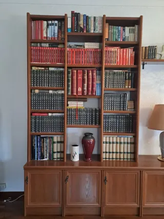 Mueble librería antiguo con puertas inferiores. Presenta un diseño clásico y elegante. - Estructura de madera. - Puertas con tiradores. - Estantes para libros y objetos decorativos.