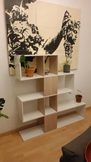 Mueble de almacenaje versátil que puede usarse como librería, estanterías o incluso mueble de TV. Lo puedes poner en vertical o en horizontal. Preparado para empotrar a la pared. Madera buena, mueble de calidad! Es de una tienda de muebles no Ikea. 4 estanterías de 29 cm de alto y 26 de profundidad Medidas totales: 34 ancho - 130 alto - 28 fondo Se vende sola o con la mesita auxiliar de la última foto.