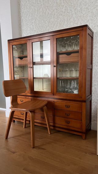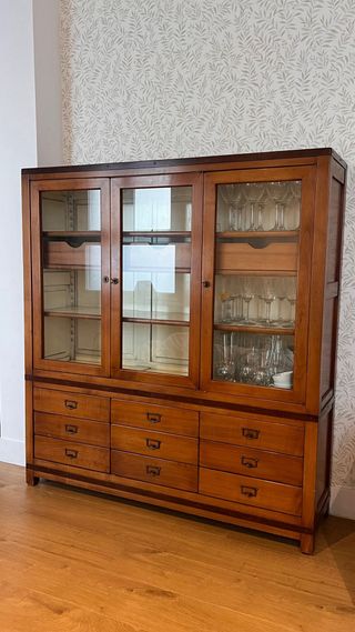 Oportunidad! Mueble colonial moderno (no antiguo). Libreria, vitrina, alacena notario madera maciza, cerezo. Color, efecto anticuario. Los puntos negros son del acabado que tiene. Las medidas: 1,30 cm de ancho, 1 42 cm de alto y 35 cm de fondo. Està compuesto de tres vitrinas cada una con su correspondiente cajón. Puestas con llave. La parte baja de la libreria consta de 9 cajones. Esta comprada en muebles Sarmiento. Ideal para partículas, despachos, negocios, estudios, despachos.