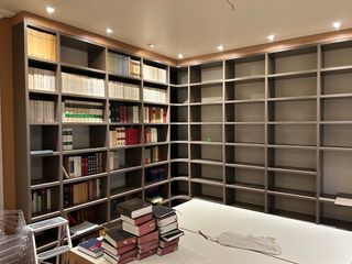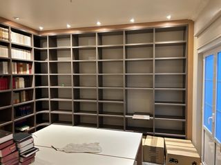 Práctica librería modular en forma de L, ideal para aprovechar al máximo el espacio. - Medidas: 390/300 cm de largo, 36.4 cm de fondo y 259 cm de alto. - Diseño en L para esquinas.