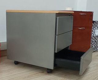 Urge por traslado. A retirar hasta el 19 de enero. NO se hacen envíos. Dimensiones en las fotos. Con 3 cajones con llave y guías telescópicas de deslizamiento suave. Sistema antivuelco de seguridad que bloquea un cajón al abrir el otro, evitando que el mueble se caiga. Incluye ruedas para fácil movilidad. Tenemos una librería a juego. Ver en el perfil. A retirar en Bilbao. NO se envía.Mueble auxiliar de oficina con tres cajones y ruedas para facilitar su movilidad. Incluye llave para el cierre de seguridad. - Medidas aproximadas: 56 cm de alto x 42 cm de ancho. - Acabado en color gris con tapa de madera.