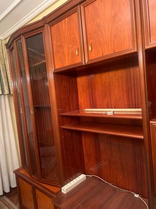 Mueble de salón modular de madera con acabados de alta calidad. Combina espacios de almacenaje cerrados y estanterías. - Mueble vitrina con puertas de cristal. - Módulo con cajones en color azul. - Módulo con puertas de madera. - Librería - Grosor baldas 3 cm Chapa trasera, 1 cm de grosor - Fácil montaje (se facilita hoja con instrucciones) Se adjunta croquis con medidas Negociable