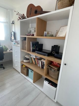 Estantería de madera maciza en blanco y roble. En muy buen estado.