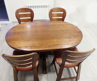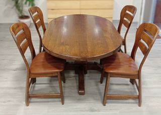 Agradable mesa ovalada de 199*99 cm con pata central y cuarto sillas de madera de roble macizo con tapiceria de pie original, con respaldo curvo muy cómodo. Muebles de origen holandés de gran calidad
