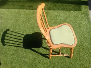 Silla de madera vintage con respaldo de barrotes torneados. Silla de diseño. Retapizada con las tachuelas originales. Muy cómoda.