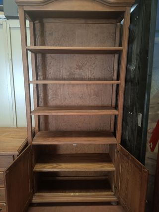 Mueble de salón librería de madera con detalles dorados viejo ,tiene algunos golpes que pongo en una foto .Venta en persona.No hago envíos pero conozco una empresa que hace portes muy baratos .