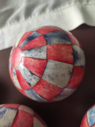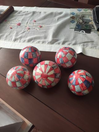 Conjunto de esferas decorativas para centros de mesa, estantes, librerías, etc. Imitación a mármol. Hay 4 de 10 cm de diámetro y una de 12 cm de diámetro.