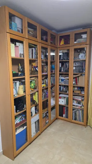 Conjunto de de 3 librerías Bily con altillo y puertas de vidrio. Medidas con altillo y puertas de cada libreria: 2,37m x 80cm x 32cm El precio original del conjunto son 750€ Pueden venderse el conjunto completo o cada libreria por separado junto con su altillo. Precio del conjunto: 270€ Individuales: 95€