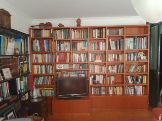 3 muebles librerías de gran capacidad. Un módulo estrecho con cajones. Dos módulos con baldas de arriba a abajo. Un módulo con baldas hasta media altura y hueco grande abajo ( era el hueco para el radiador ).