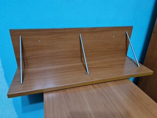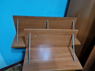 Vendo lote de 2 estantería librería en color cerezo prácticamente nuevas la pequeña mide Ancho 53cm alto 26cm fondo 28cm y la otra ancho 82 cm alto 26 cm fondo 28 cm si alguien quisiera solo una hablar para cambiar en anuncio