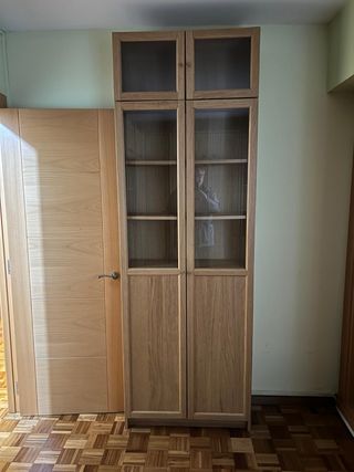 Práctica librería Billy de Ikea, ideal para organizar tus libros y objetos. - Diseño de madera con puertas de cristal. - Estructura robusta y elegante. medidas. alto: 237 cm profundo: 30 cm ancho: 80 cm