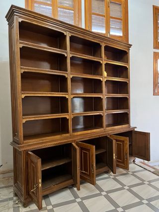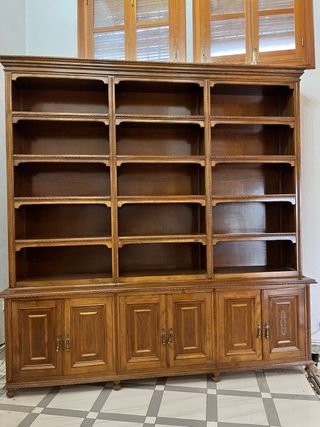 Mueble de madera maciza,con puertas superiores de vidrio. Se puede dividir en 6 partes para transportarla más fácilmente , tanto parte superior como inferior . Sus medidas son : 300 cm largo, 250 cm alto y ancho 35 cm parte superior y 45 cm parte inferior. Se conserva en buen estado