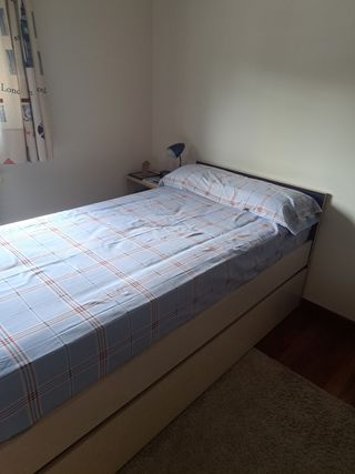 Habitación completa que consta de: . cama nido de 90x190 con dos colchones . 2 librerías de 70x25x165 . mesa de estudio de 150x75x73 . cómoda de 3 cajones de 80x40x83,5 . silla de estudio . barra y cortinas . estantería de pared de 93x20x66 . mesita de noche de 49x30x60 No incluye alfombra.
