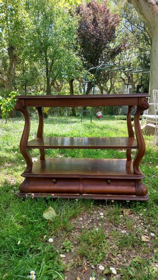 Mesa auxiliar de madera maciza tallada, con dos cajones en la parte inferior. Ideal para poner la televisión o como pequeña librería o mueble auxiliar