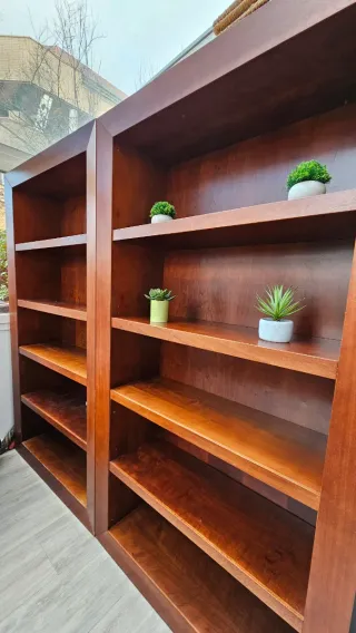 Elegante librería de madera con un acabado en tono marrón cálido. Sus estantes ofrecen un amplio espacio para libros y objetos decorativos. Son 2 estanterías cada una de 115x215 - Diseño de líneas rectas y modernas. - Construcción robusta y duradera.