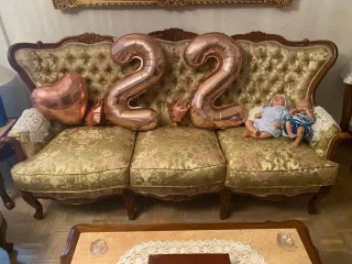 Elegante sofá de tres plazas con un diseño clásico y tapicería floral. Día individual a juego, mesa, 6 sillas y librerías. Posibilidad de mesita de fumador a juego con mármol, librería. Todo como nuevo, madera noble. Posibilidad de envío personalizado a mediados de febrero en comunidad de Madrid. Se vende junto o por separado. Ya la mesa y sillas valen el precio por si solas. - Estructura de madera tallada. - Tapicería de tela con estampado floral. - Asientos cómodos y amplios.