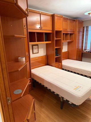 dormitorio formado por. *cama nido para 2colchones de 1.05 NO INCLUIDOS *mesa escritorio con arcón y mesita, 2,32 ancho x56ancho *estanteria-libreria con 6 cajones, alto 2,11x ancho 46x fondo 56. *cubo de 43.5x43.5cm *3 estanterías individuales: número 1 medidas 101x 25 número 2 medidas 100x 25 número 3 51x 25 el mueble se encuentra en zona próxima a la bañeza. no se hacen envíos