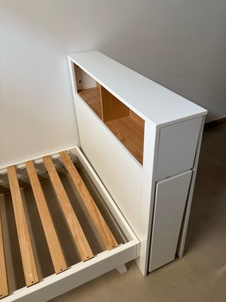 Cama individual con somier de láminas de madera. 90 x 200cm Tiene cabecero tipo librería que puede abrir y cerrar. La vendo con el colchón de la marcha Emma. Muy poco uso del colchón. - Estructura de cama blanca. - Somier de madera.