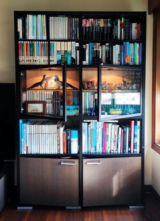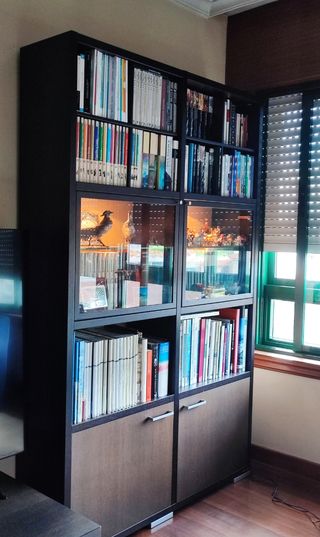 Precioso mueble librería de salón wengué de muy buena calidad. Diseño moderno y elegante que combina madera y cristal. Se encuentra en muy buen estado. Adecuado para organizar libros, objetos decorativos y almacenaje. Configurado por: - Baldas abiertas en la parte superior - 2 vitrinas con puertas de cristal e iluminación interior en la zona central - 2 compartimentos inferiores con puertas. Dispone de 2 interruptores de pie para el encendido de las luces interiores.
